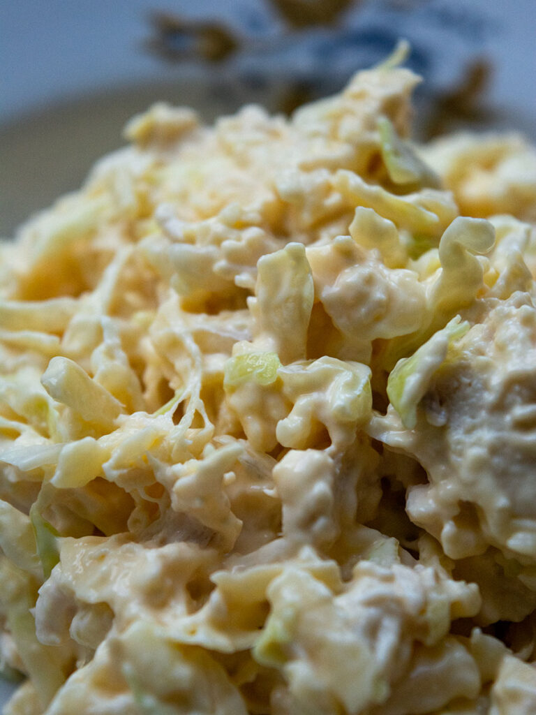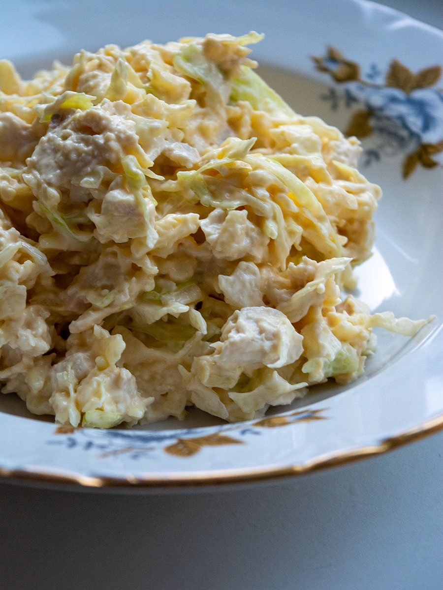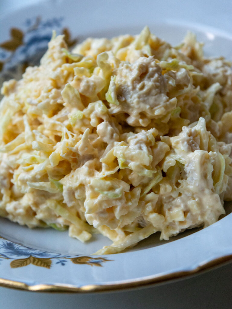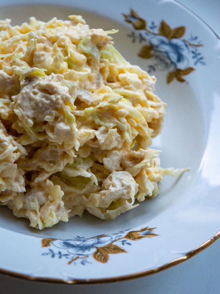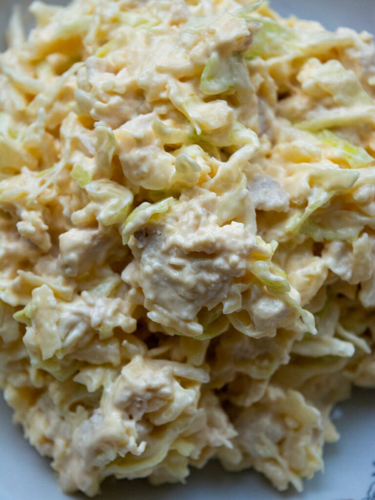 Pus kāpostu smalki sagriež – mazliet saspaida – tā atceros bērnībā darīja mana krustmāte, lai ir mīkstāki. Sieru sarīvē, vistu izvāra un sagriež kubiņos, pievieno majonēzi – VISS. Garšo visai ģimenei. 🙂 Kā mans vīrs saka “Om nom nom”. 😀