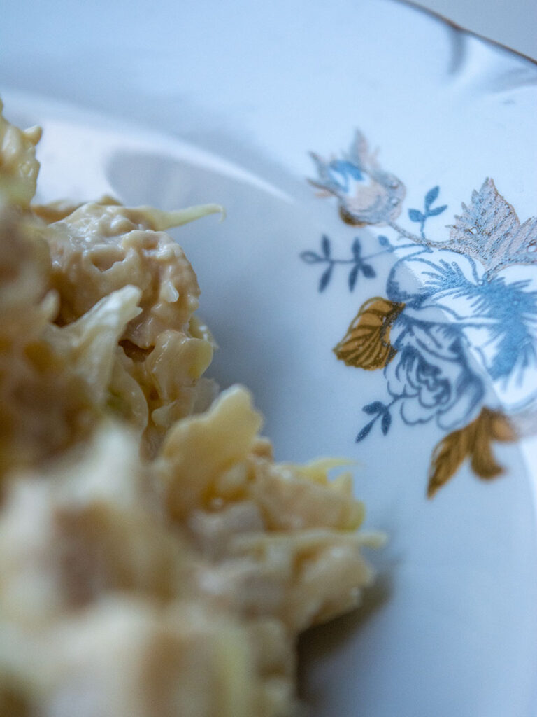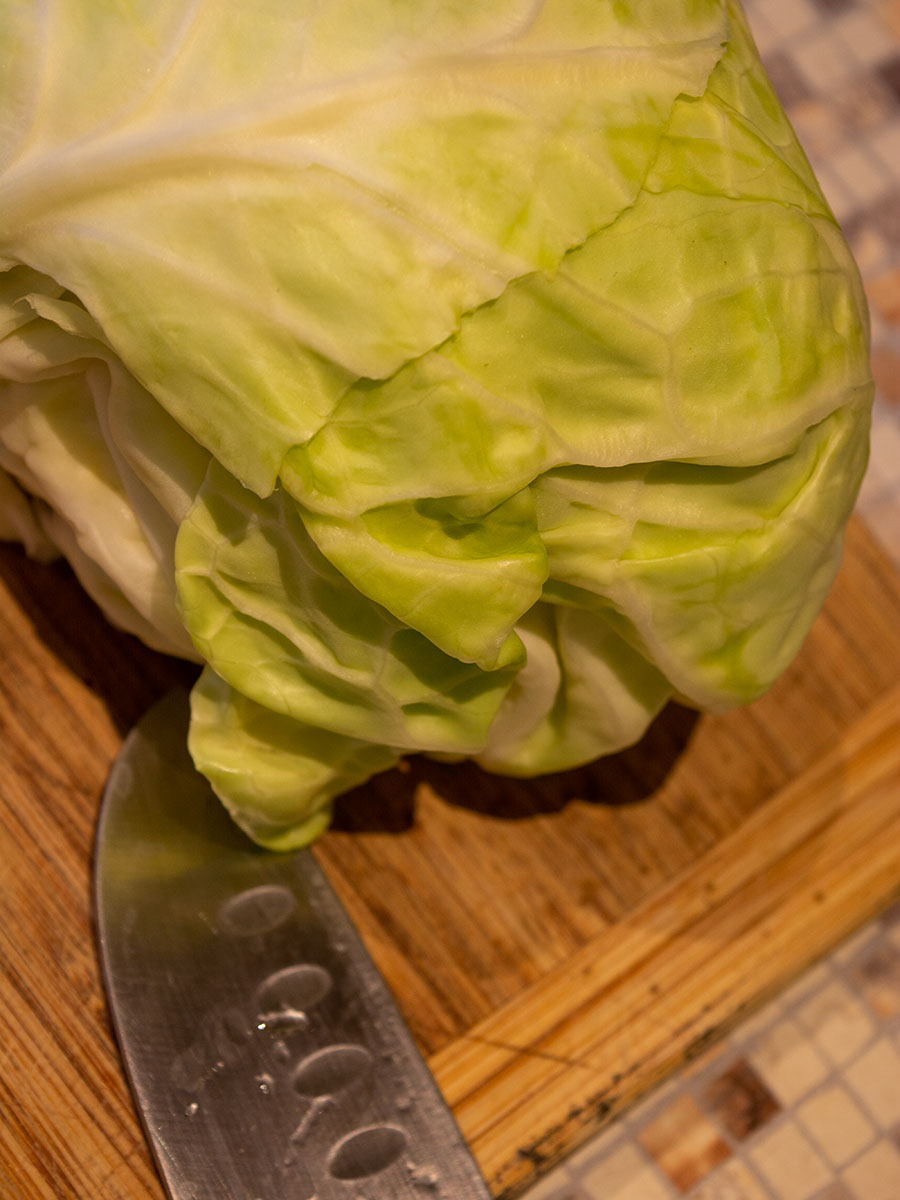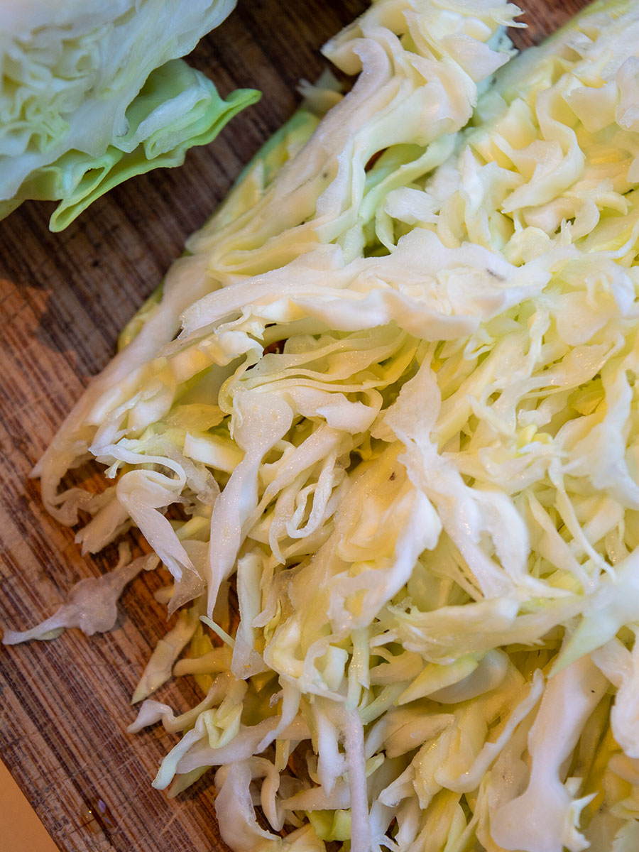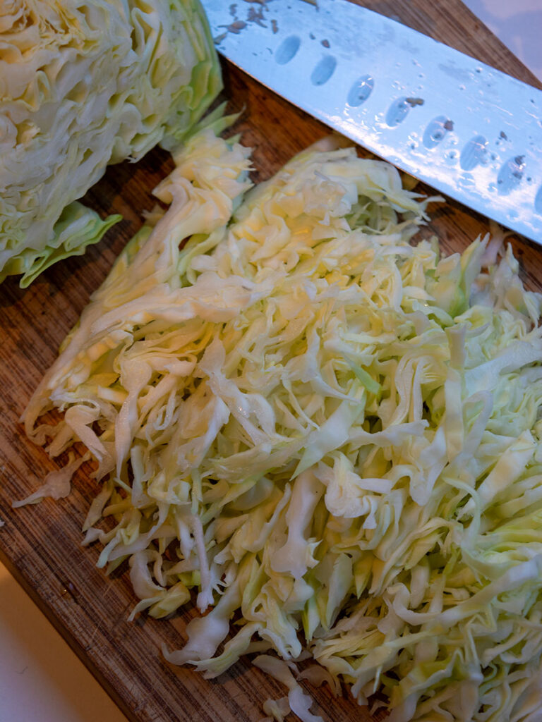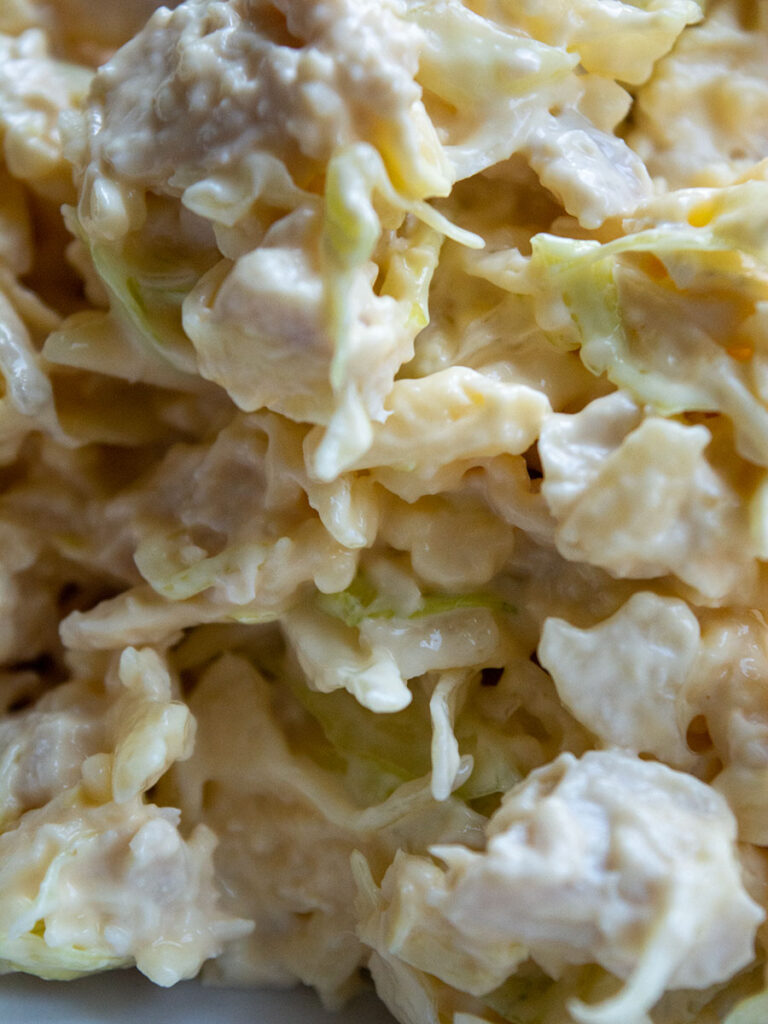 Pus kāpostu smalki sagriež – mazliet saspaida – tā atceros bērnībā darīja mana krustmāte, lai ir mīkstāki. Sieru sarīvē, vistu izvāra un sagriež kubiņos, pievieno majonēzi – VISS. Garšo visai ģimenei. 🙂 Kā mans vīrs saka “Om nom nom”. 😀